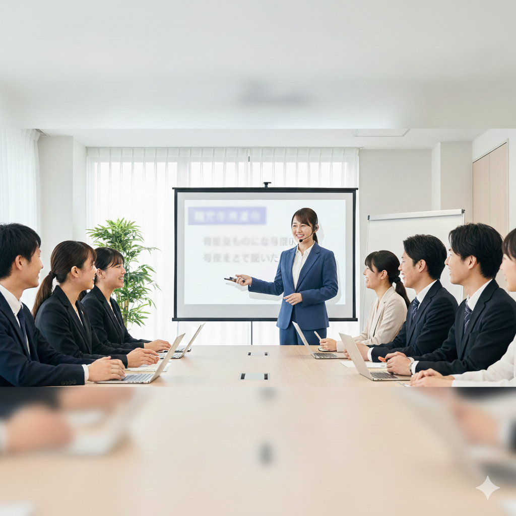 • 新入社員ビジネスマナー研修: 挨拶、身だしなみ、名刺交換、電話応対といった「ビジネスの基本」を徹底。なぜその振る舞いが必要なのかという「意味」を理解することで、現場で自信を持って動ける基礎を築きます。
